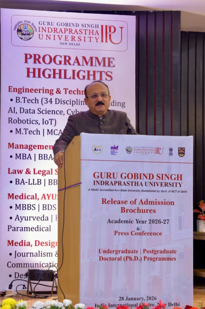 नई दिल्ली रिधि दर्पण अरुण शर्मा दिल्ली के छात्रों के लिए उच्च शिक्षा के नए द्वार खोलते हुए गुरु गोबिंद सिंह इंद्रप्रस्थ विश्वविद्यालय (GGSIPU) ने शैक्षणिक सत्र 2026-27 के लिए UG, PG और PhD कार्यक्रमों के तीन प्रवेश ब्रोशर जारी कर दिए हैं। इसके साथ ही विश्वविद्यालय ने 24 नए शैक्षणिक पाठ्यक्रमों की घोषणा की है, जिससे राजधानी में पढ़ाई के अवसर और व्यापक होंगे। इंडिया इंटरनेशनल सेंटर (IIC) में आयोजित कार्यक्रम में दिल्ली सरकार के शिक्षा मंत्री श्री आशीष सूद और कुलपति प्रो. (डॉ.) महेश वर्मा ने संयुक्त रूप से प्रवेश ब्रोशर का लोकार्पण किया। विश्वविद्यालय की ऑनलाइन आवेदन प्रक्रिया 2 फरवरी से शुरू होगी।