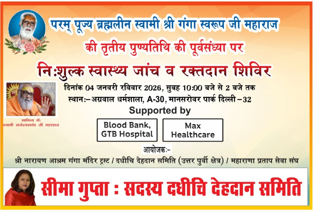 समाजसेवा के क्षेत्र में सक्रिय सीमा गुप्ता, सदस्य दधीचि देहदान समिति, के प्रयासों से एक बार फिर मानव सेवा का प्रेरक उदाहरण सामने आया है। परम पूज्य ब्रह्मलीन स्वामी श्री गंगा स्वरूप जी महाराज की तृतीय पुण्यतिथि की पूर्व संध्या पर नि:शुल्क स्वास्थ्य जांच एवं रक्तदान शिविर का आयोजन किया जा रहा है, जिसमें बड़ी संख्या में नागरिकों के भाग लेने की उम्मीद है।